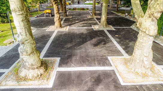 Über die Sommerferien war der Stadthallen-Vorplatz aufgrund von Sanierungsarbeiten vorübergehend gesperrt