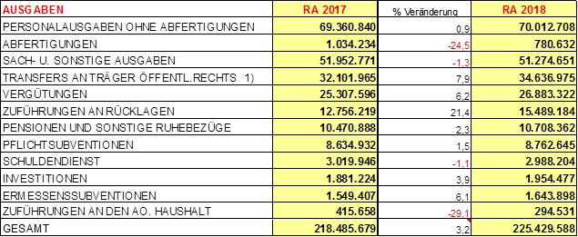 Subventionen: Hier ergeben sich gemeinsam für die Pflicht- und Ermessenssubventionen 2018 Ausgaben von 10,41 Mio. Euro gegenüber 2017 10,18 Mio. Euro. Hier ist zum Beispiel die Abgangsdeckung für die privaten Kindergärten enthalten, wofür 2017 3,32 Mio. Euro und 2018 3,41 Mio. Euro aufgewendet wurden.
