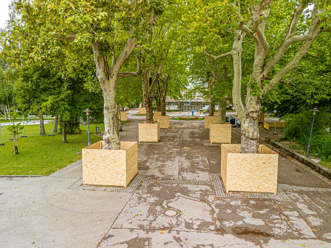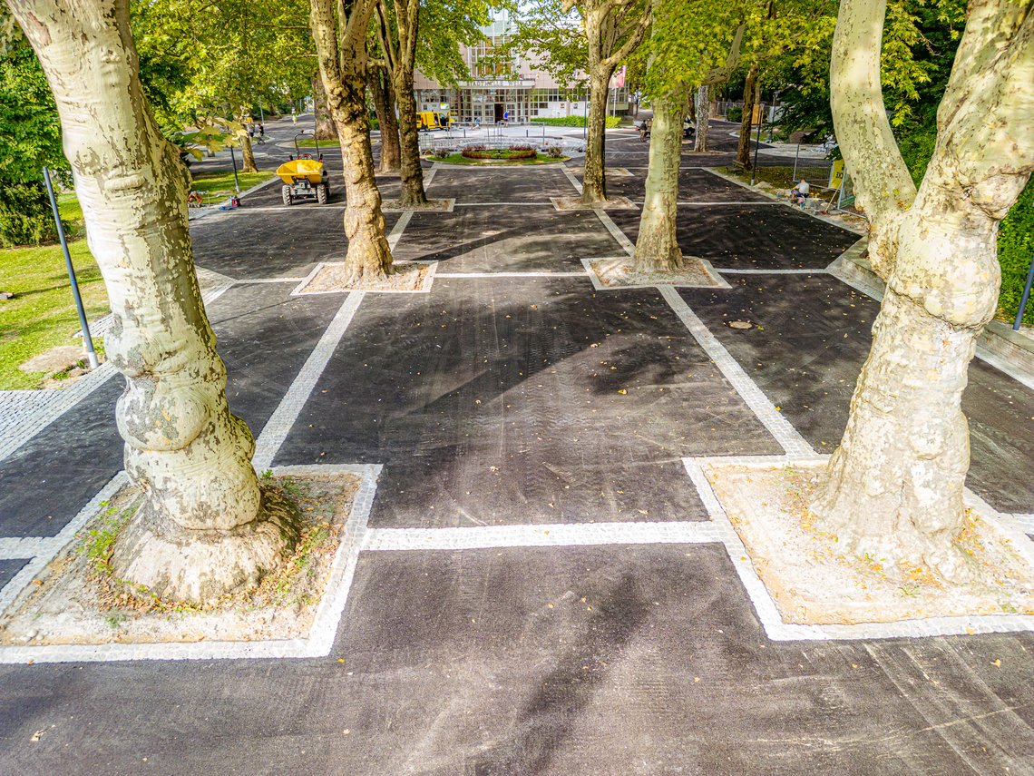 Der Vorplatz erhielt im Zeitraum Juli bis September einen neuen Deckasphalt, die Eingangszone vor der Stadthalle eine Kleinsteinpflasterung. Die Baumscheiben wurden zum Teil vergrößert und die Baumeinfassungen mit Pflastersteinen erneuert, um den Schutz des vorhandenen Baumbestandes (Plantanen) zu gewährleisten, denn die Exemplare sind teilweise um die 150 Jahre alt.
