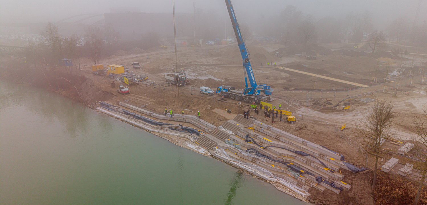 Mit der Welser Bucht entsteht – wie bereits berichtet – ein attraktiver Aufenthalts- und Begegnungsraum direkt am Fluss. Sie wird insgesamt 75 Meter lang und 15 Meter breit sein. Zusammengerechnet ergeben die 127 einzelnen Betonfertigteile ein Gesamtvolumen von rund 98,5 Kubikmeter Beton mit einem Gesamtgewicht von rund 259 Tonnen. Die Betonsitzstufen werden einen freien Blick auf die Traun und den direkten Kontakt zum Fluss ermöglichen und auf diese Weise die Besucher zum Verweilen, Sonnenbaden und Erleben einladen.